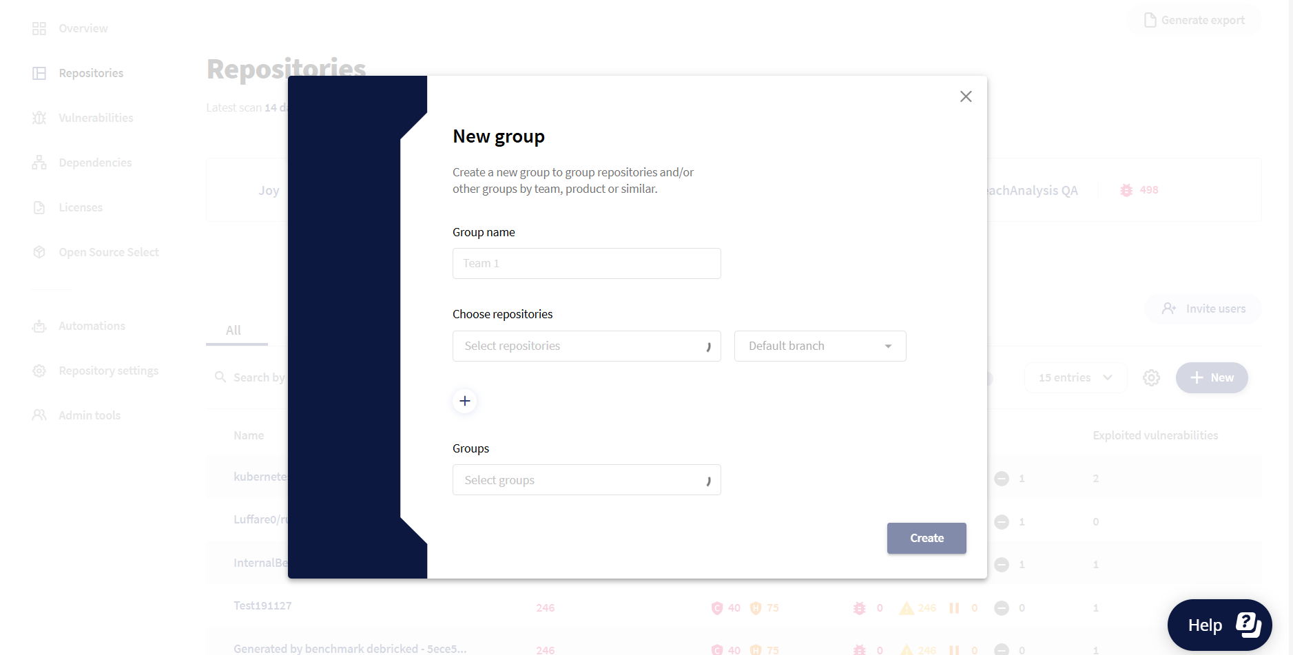 Once created, the group will be shown with the name and aggregation of vulnerabilities in the linked repositories and groups. You can also view the default branch details in the repositories tab of repo groups.