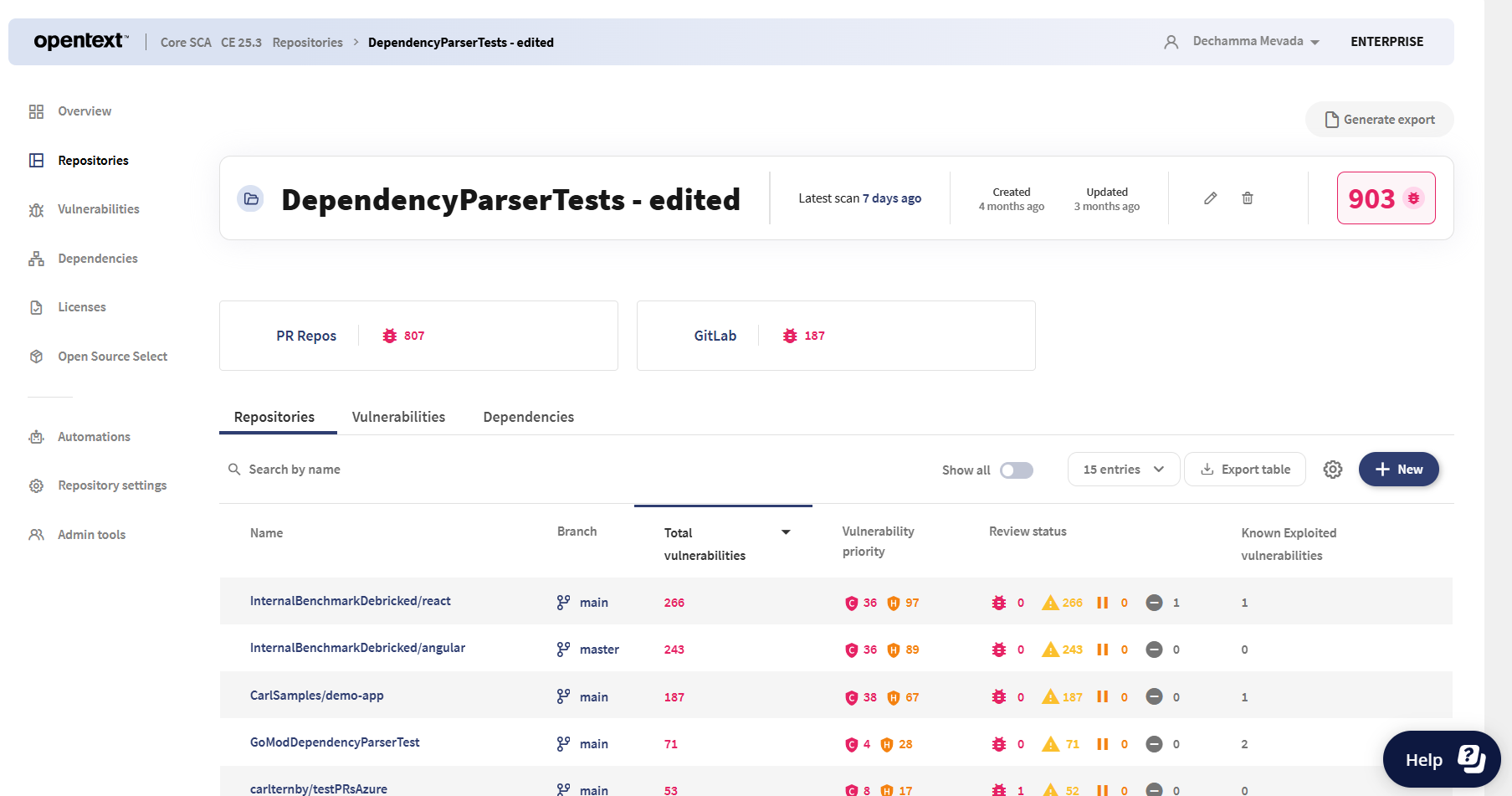 It can be difficult to get a quick overview of all your repositories, especially if you have a lot of them. To make your life a bit easier, the OpenText Core SCA tool enables you to group repositories together, allowing you to organize your projects, e.g. based on team structure.