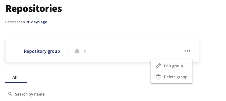 You can edit or delete a specific group by clicking on the three dots next to the group’s name. Clicking **Edit** will open the same view as when creating the group, enabling you to select or deselect repositories or groups included in the group. Keep in mind that if you delete a group, all groups that exist solely within this group will also be deleted.